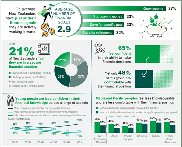 This paper found that only 21% of Kiwis feel they are financially secure, only 32% have a goal to save for retirement.